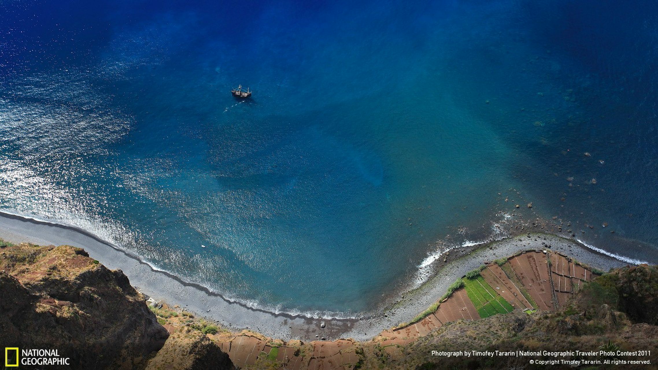 Вид с Кабо-Жирао, крутого морского утеса на южном побережье острова Мадейра. С него открывается захватывающий дух вид на Атлантический океан, а в ясный день тут можно также увидеть закругляющуюся линию земного горизонта. Кабо-Жирао — один из самых высоких утесов в Европе: его высота — около 560 метров