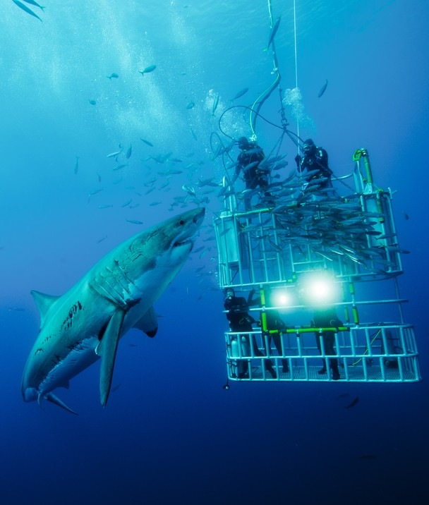 Дайверы в клетке и белая акула